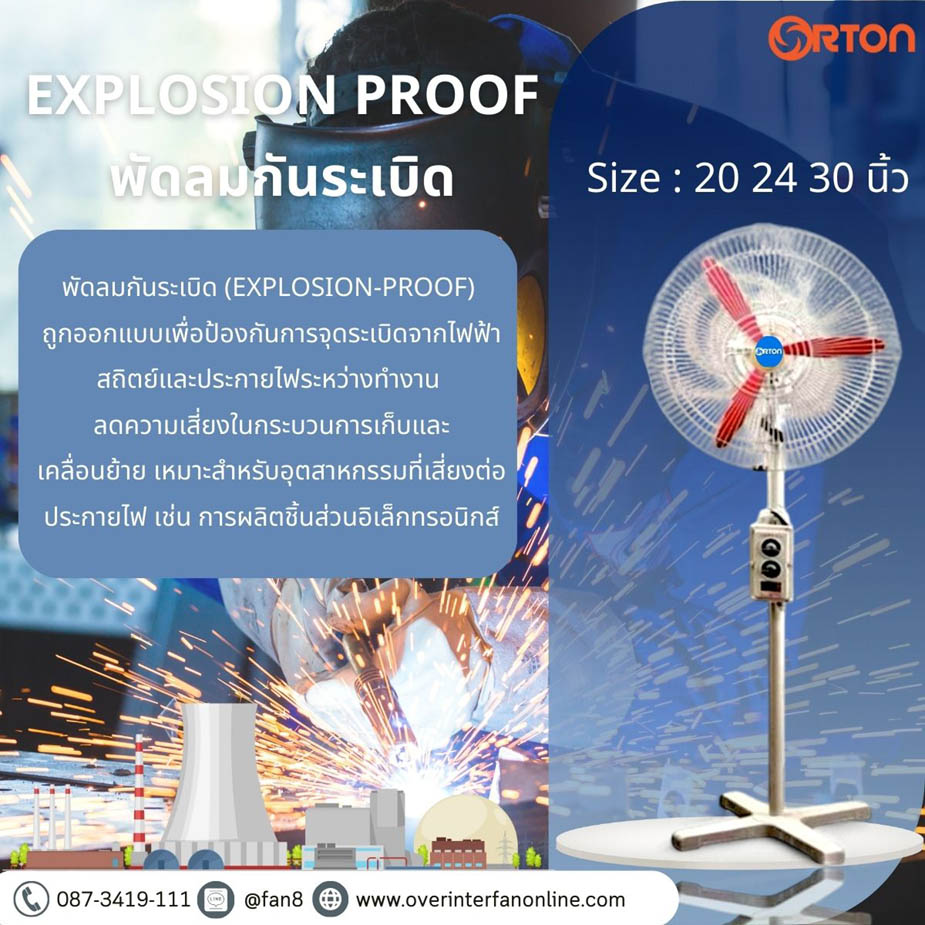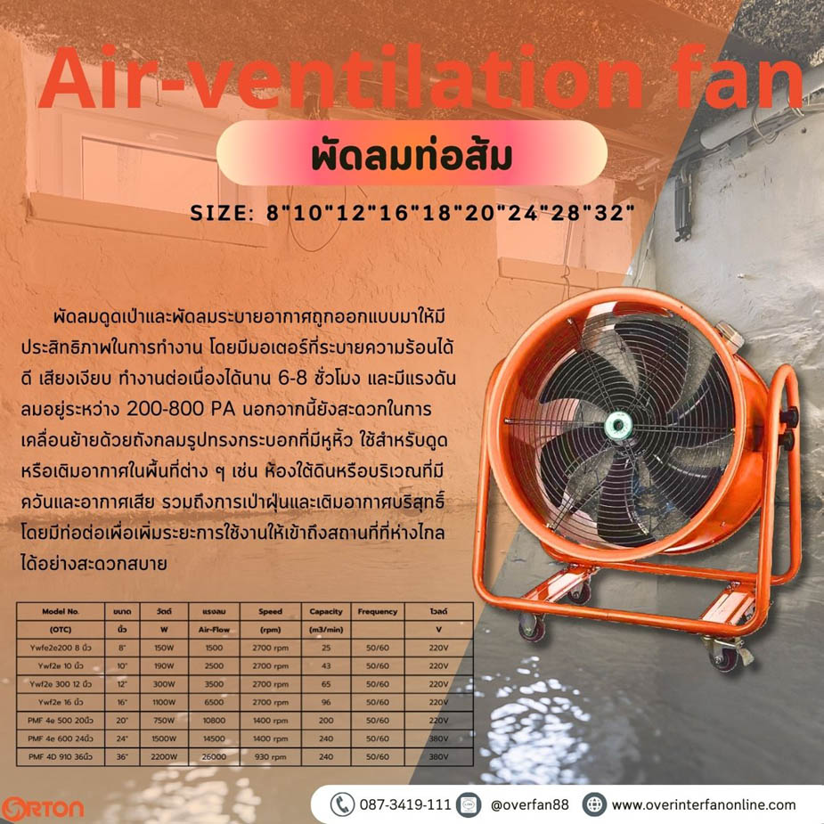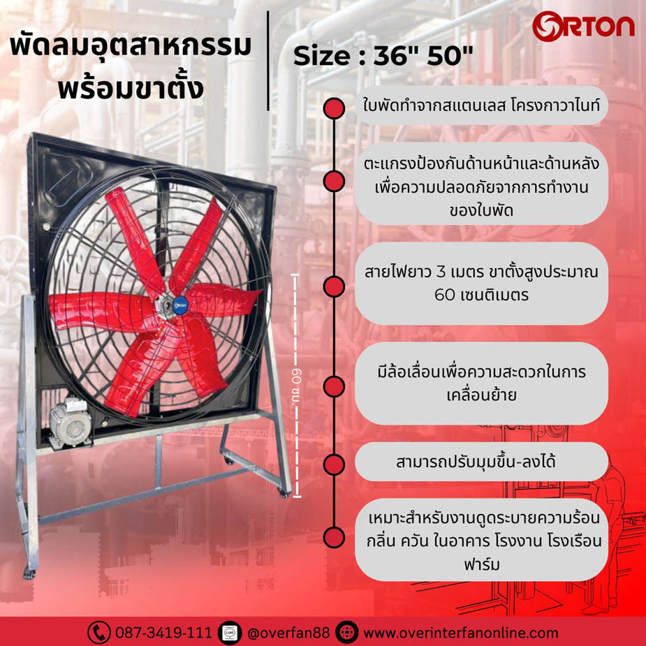 พัดลมแบบพัดลมตั้งพื้น ขนาด 20 นิ้ว 24 นิ้ว 26 นิ้ว 30 นิ้ว 36 นิ้ว 50 นิ้ว ใช้ดูดระบายความร้อน กลิ่น ควัน ในอาคารให้ปริมาณลมมาก ทนทาน ประหยัดไฟ ใช้งานระบายอากาศในโรงงาน ที่จอดรถ หอประชุม สนามกีฬา ให้ปริมาณลมแรง